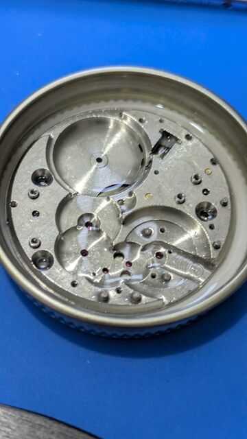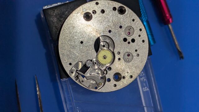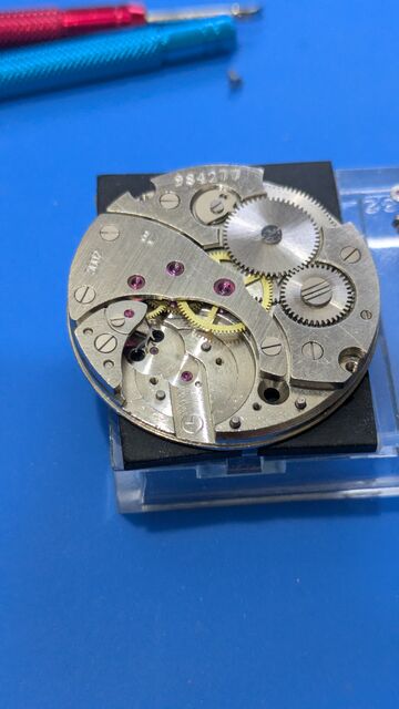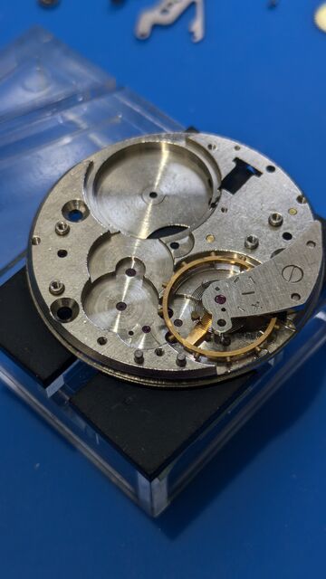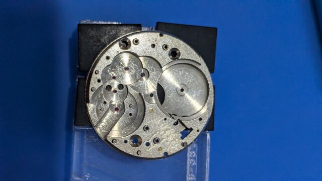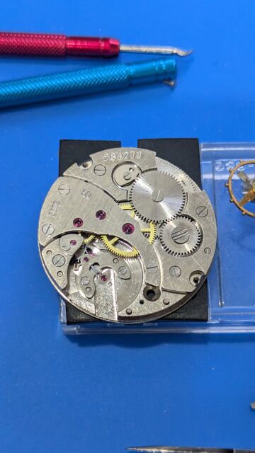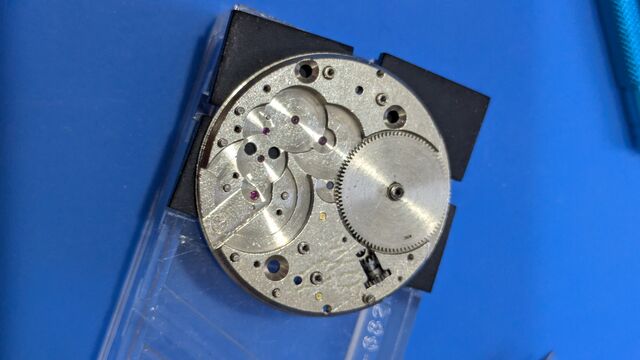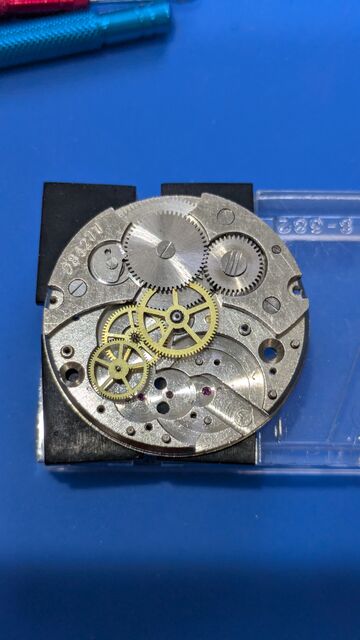 というわけで早速OH。実はバラす前に裏蓋を開け、テンプをなんどかつつくと緩く動き出したので何度も往復させてると、文字板下の位置の時はちゃんと動くようになったのである。古い時計あるあるで時計油の固着による停止で、故障などではないのが分かり安心した。また、こうした個体は無理して動かされていないので状態が良い事が多い。なので、期待をもってOHできるのが嬉しいのであった。