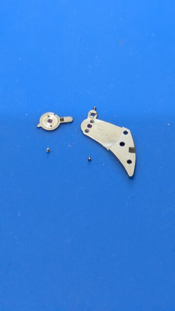 テンプ受けの裏側、この時代(1987年)は正直耐震装置があってもいい時代だと思うのだが、まだそう一般的ではなかったのであろう。このように原始的、あるいは牧歌的な構造になっている。これがまた、いいのである。ルビーの左右の小さな(といっても懐中時計なので大きく感じる)ねじを外してさらに分解する。二つつきでている突起は、ひげを通す場所である。