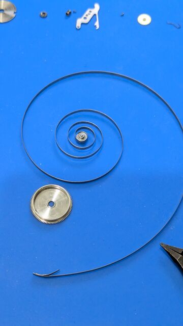 裏返して、まずはテンプを取り外す。なんと巻き上げヒゲである(懐中時計では普通なのか!?)。緊張。