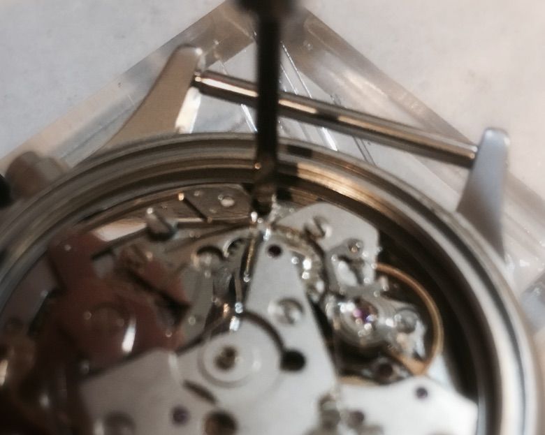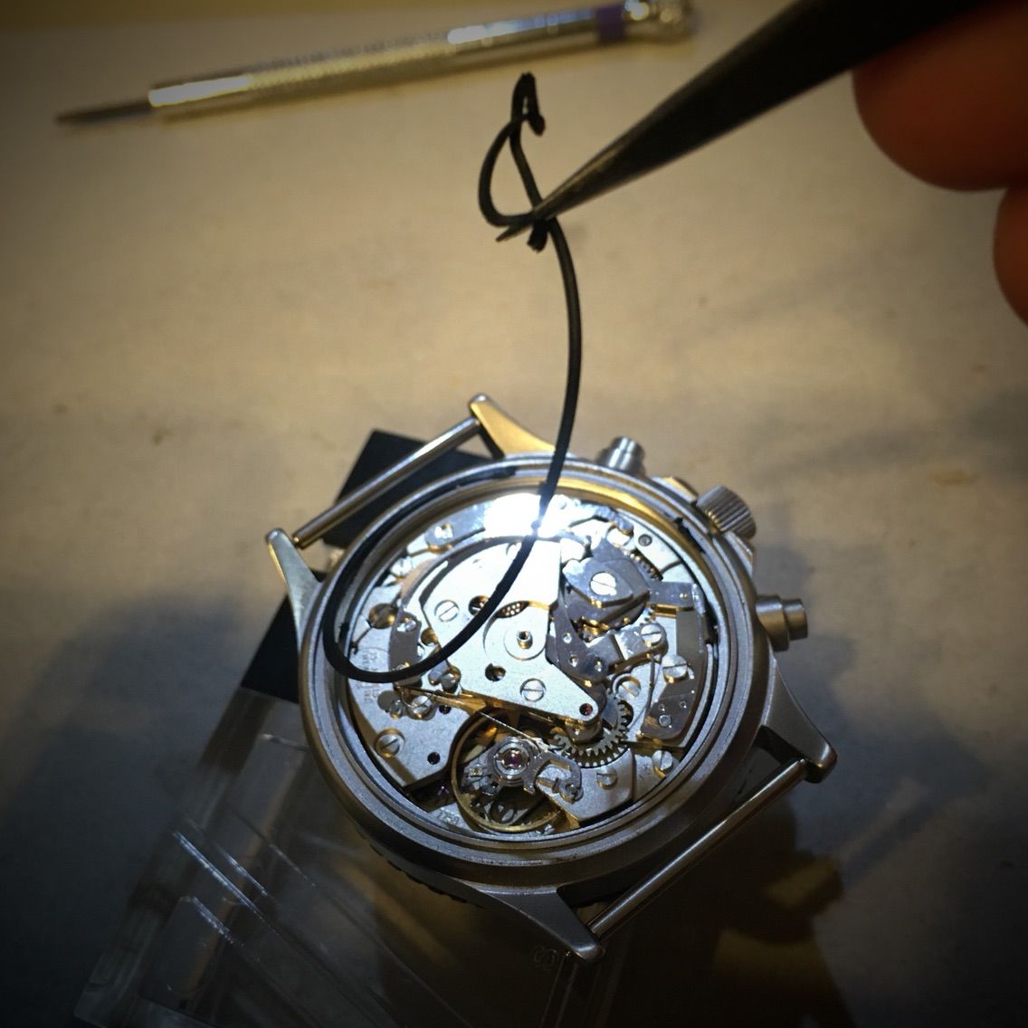 こうなってしまうと粉が出てムーブの故障に繋がるので、ブロアーでシュッシュと粉を吹き飛ばし、ロディコという練り消しのようなやつでムーブに付着した目に見えないゴミを丁寧に取り除く。